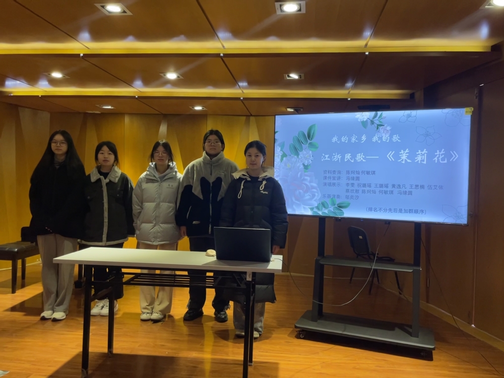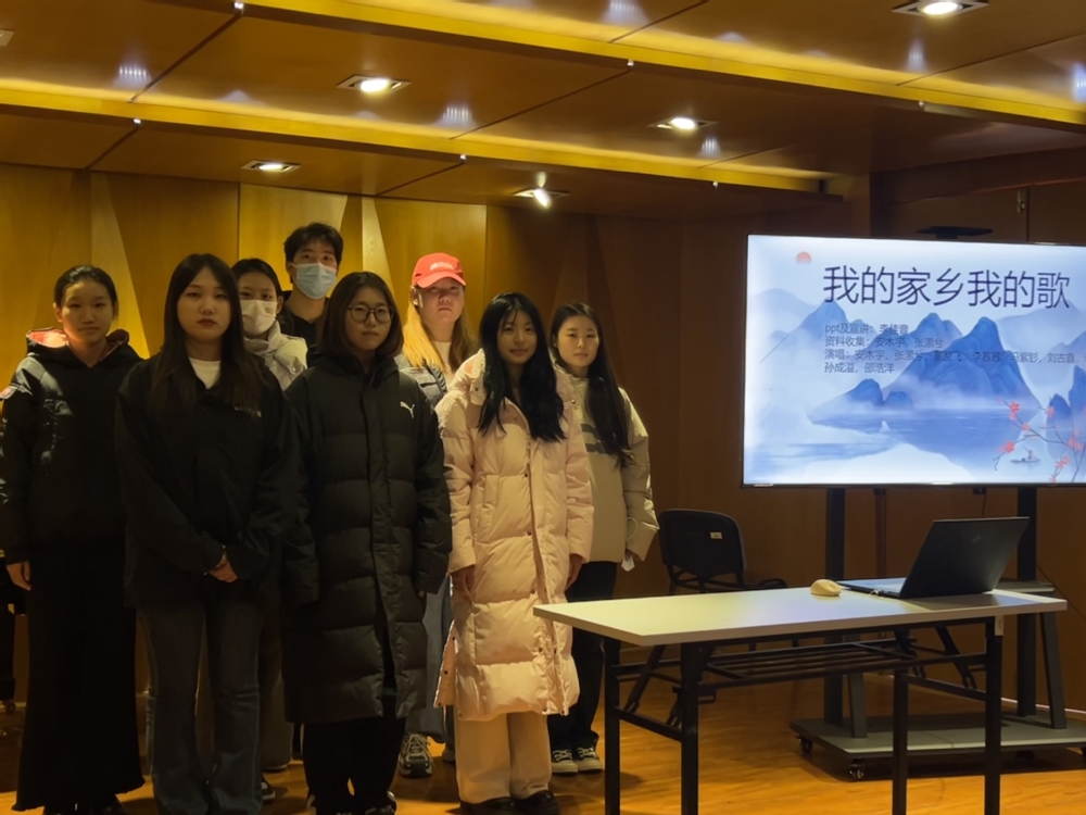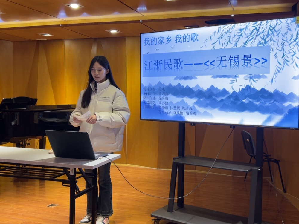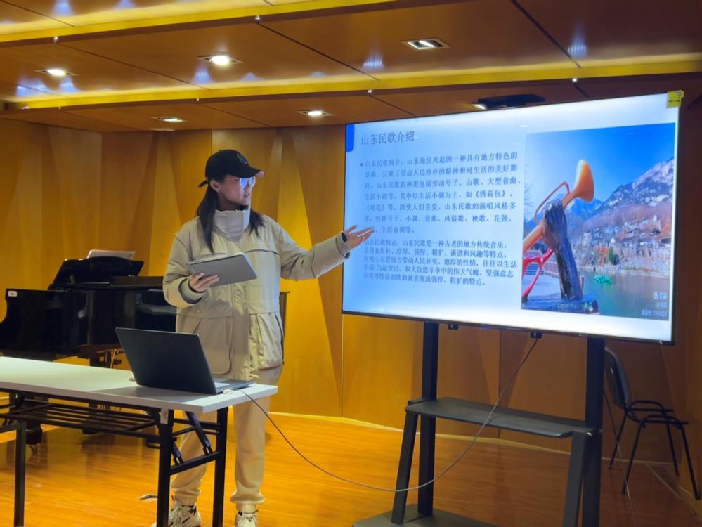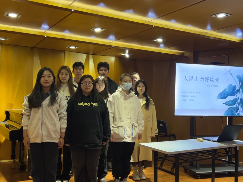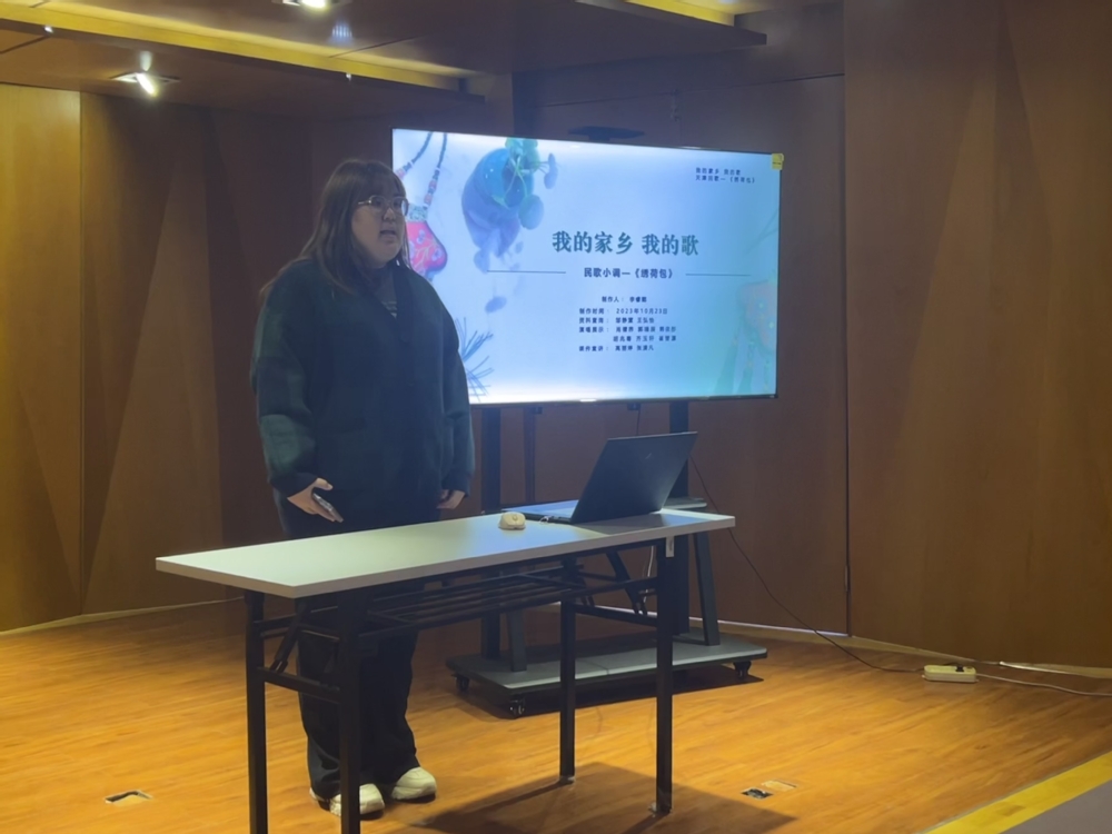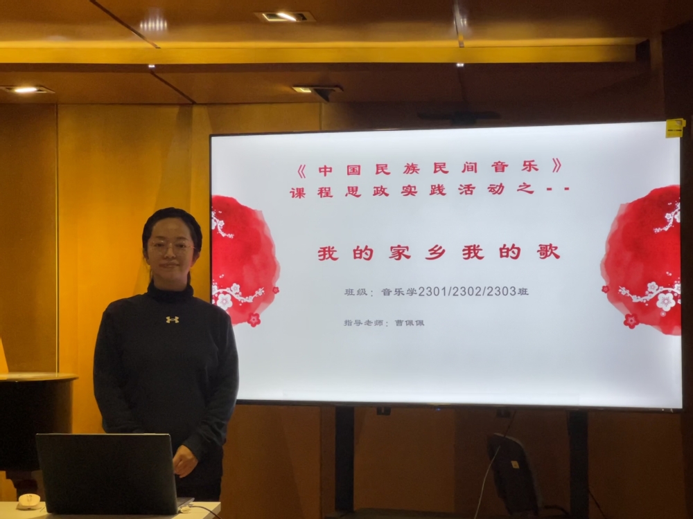 11月9日上午,《中国民族民间音乐》课程在我院老上善小厅开展了“我的家乡我的歌”思政实践活动,本次活动由任课教师曹佩佩老师策划,音创工作室执行,23级全体同学们参与,活动取得了圆满成功。 《中国民族民间音乐》课程作为音乐系一门重要的专业课程,在2022年该门课程被评为我院课程思政示范课。课程建设期间注重思政元素与专业特色的深入融合,已于2023年6月成功举办了“戏曲+思政”趣味知识竞赛,反响良好。此次活动主题“我的家乡我的歌”是该课程思政建设的又一次有益探索,通过来自不同省份同学对自己家乡风土人情的介绍,特别是对家乡民歌的介绍,旨在激发大家对家乡的热爱,对家乡民歌的热爱。