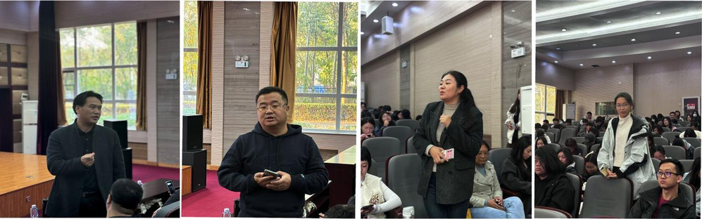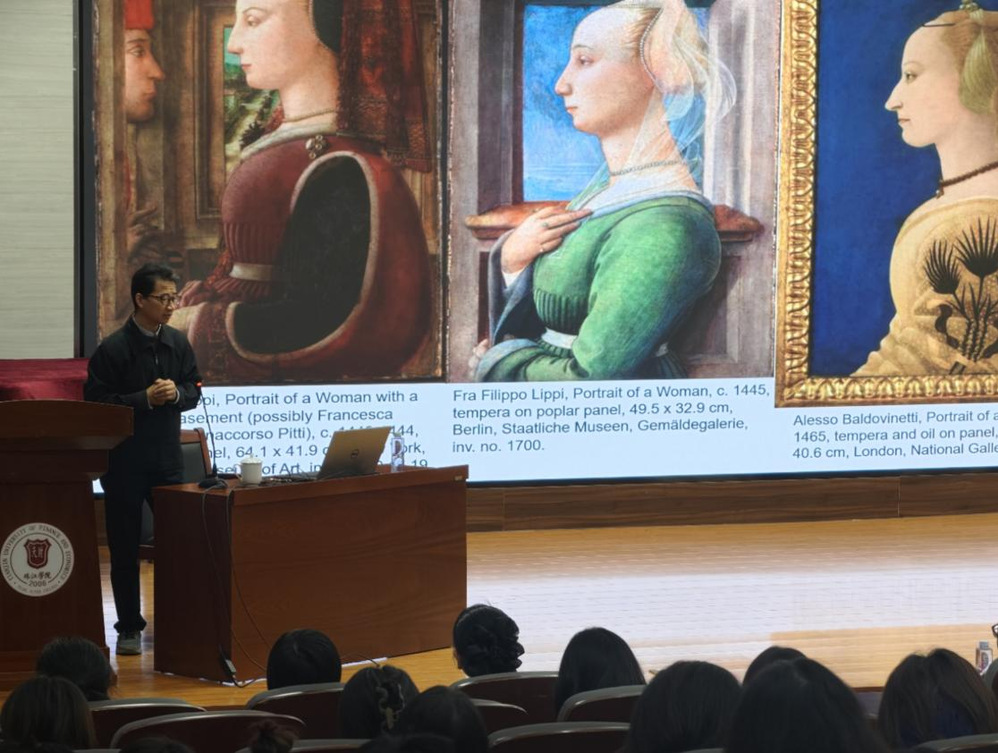 在讲座中,杨教授结合自己多年来的研究心得,深入介绍了中西方文化背景下诗歌与绘画的关系。他主张在欣赏和研究西方古典艺术时,应当具备“一种视角,多元理解”的态度,结合现代视角进行解读。其间,展示了多幅画作,帮助听众直观感受不同时期、不同艺术家笔下的女性形象与服饰风格。他特别强调,《蒙娜丽莎》的服装设计不仅反映了16世纪意大利的时尚潮流,更融入了达·芬奇个人的审美偏好和对同时代艺术家作品的学习成果,是多因素交织的产物。讲座后,杨教授还与讲座现场师生进行互动,回答了大家提出的各种问题。