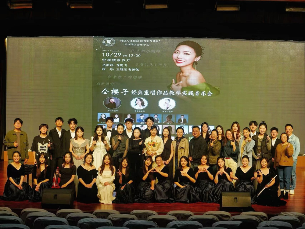 10月29日,“人文珠江 以美育人”2024珠江音乐季系列活动之仝樱子经典重唱作品教学实践音乐会于学院中和楼礼堂成功举办。活动由艺术学院音乐系主办,音创工作室承办,学工部协办。演员以丰富多彩的艺术表现形式与舞台效果,为在场近千名师生呈现了一场精彩纷呈的音乐盛宴。