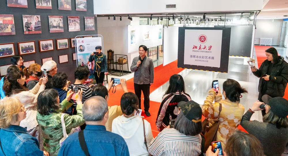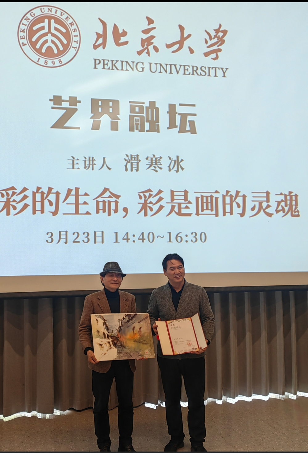 在AI技术与艺术深度融合的时代浪潮中,北京大学建筑与景观设计学院秉承“跨界创新·知行合一”的教育理念,于3月23日至30日举办第二届“艺界融坛”艺术周活动。艺术学院滑寒冰教授受邀参加北京大学“艺界融坛”艺术周活动。主办方李迪华副院长强调,北大始终秉持“以美育人”的理念,艺术周活动是学院推动艺术与学术融合的实践,并亲自向滑寒冰教授颁发学术讲座与办展邀请函。随后滑寒冰教授发表主题演讲“光是彩的生命,彩是画的灵魂”。结合展出的作品来深刻诠释演讲的主题,并做现场示范分析画面光与彩的构成。将作品《阳光下的街道》赠与北大永久收藏。讲座互动热烈,现场解答北大研究生、艺术家、水彩画爱好者存在的疑惑,对现场观众不仅是一次知识的盛宴,更是一次艺术的洗礼。
