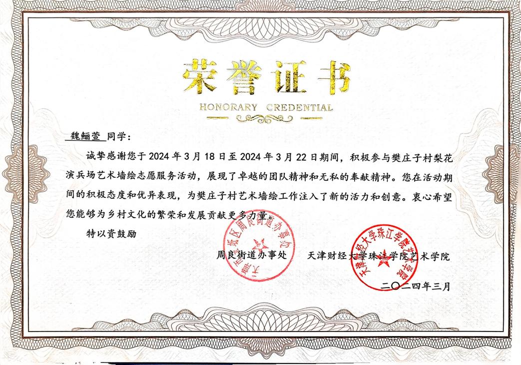 魏鲡萱在校积极参与社会实践和志愿服务活动,如迎新、运动会等,代表我校参与樊庄子村“樊庄子梨花演兵场”墙绘等活动,将所学知识应用于实际,服务于学校与社会。在家乡也积极主动关爱他人,参与社区服务活动,暑期社会实践中获得徐州市“优秀慈善义工”,为更科学地帮助他人,魏鲡萱在暑假期间学习并考取了CPR➕AED等技能证书。