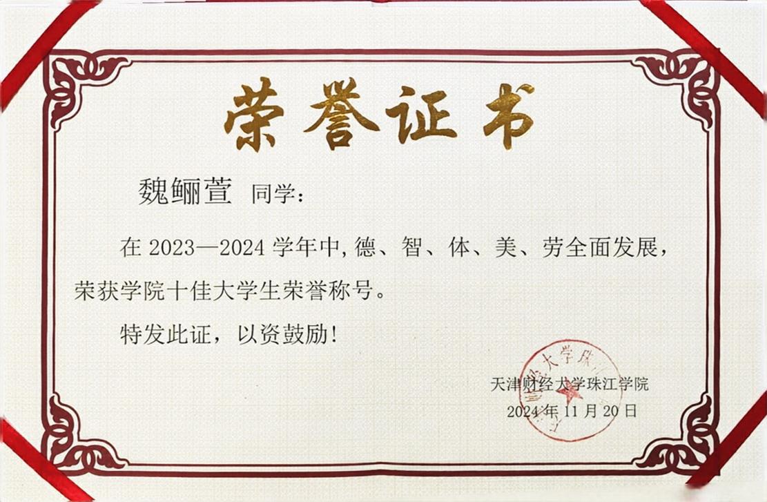 魏鲡萱始终保持“学无止境,气有浩然”的态度,有规划与目标地完成专业知识,积极探索课外知识,大一大二学年均获“一等奖学金”、“单科奖学金”,绩点保持4.0➕。除了专业学习以外,还热衷于参与各类学术竞赛和创新实践活动,积极提高自己“六项能力”,曾获十七届挑战杯省部级三等奖、第十届中银杯天津市铜奖、大学生创新创业天津市立项并结项、海河工匠杯天津市三等奖等。从接触比赛到现在,始终坚信,每一次失败都是一次学习的机会,每一次成功都是一次激励自己的动力。