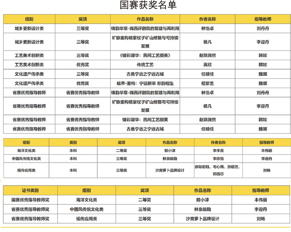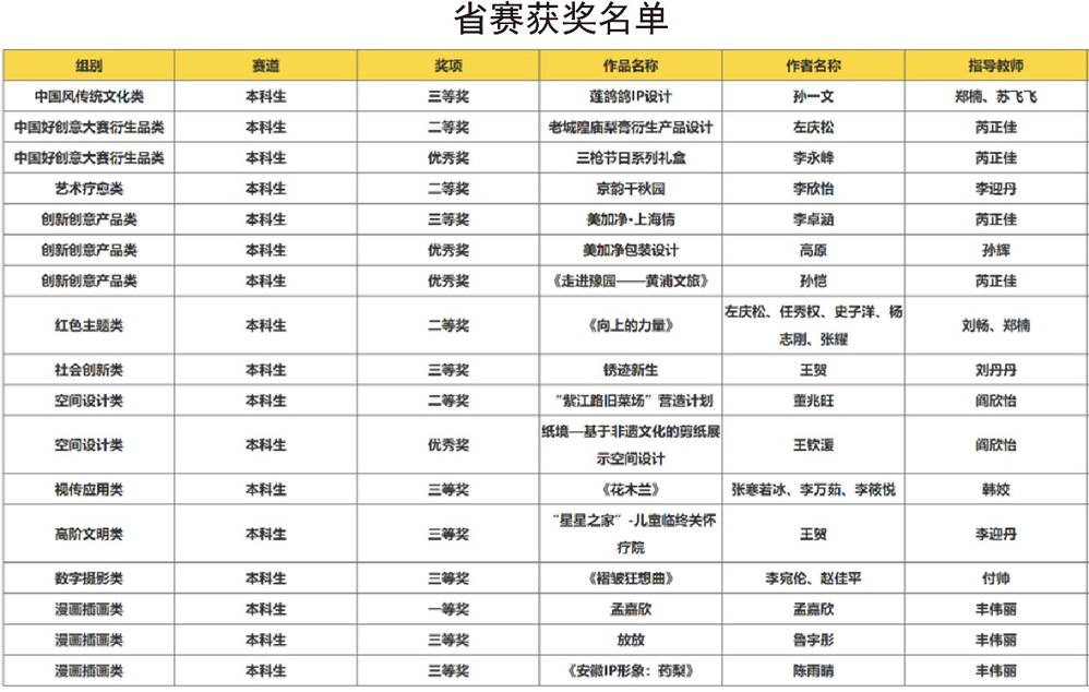 本届大赛中,艺术学院师生凭借出色创意与专业实力,荣获国赛奖项12项(二等奖 1项、三等奖6项、优秀奖4项、特殊贡献奖1项),省赛奖项17项(一等奖1项、二等奖4项、三等奖8项、优秀奖4项),李迎丹、刘丹丹、魏娜、韩娇等教师荣获“优秀指导教师”称号。