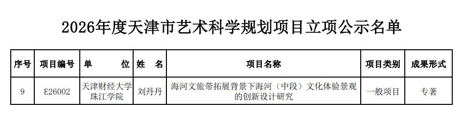 近日,天津市艺术规划办公室公示了“2026 年度天津市艺术科学规划项目立项名单”,我校艺术学院刘丹丹副教授主持的《海河文旅带拓展背景下海河(中段)文化体验景观的创新设计研究》项目成功获批立项,彰显了我校在艺术学应用研究领域的扎实基础与创新实力。