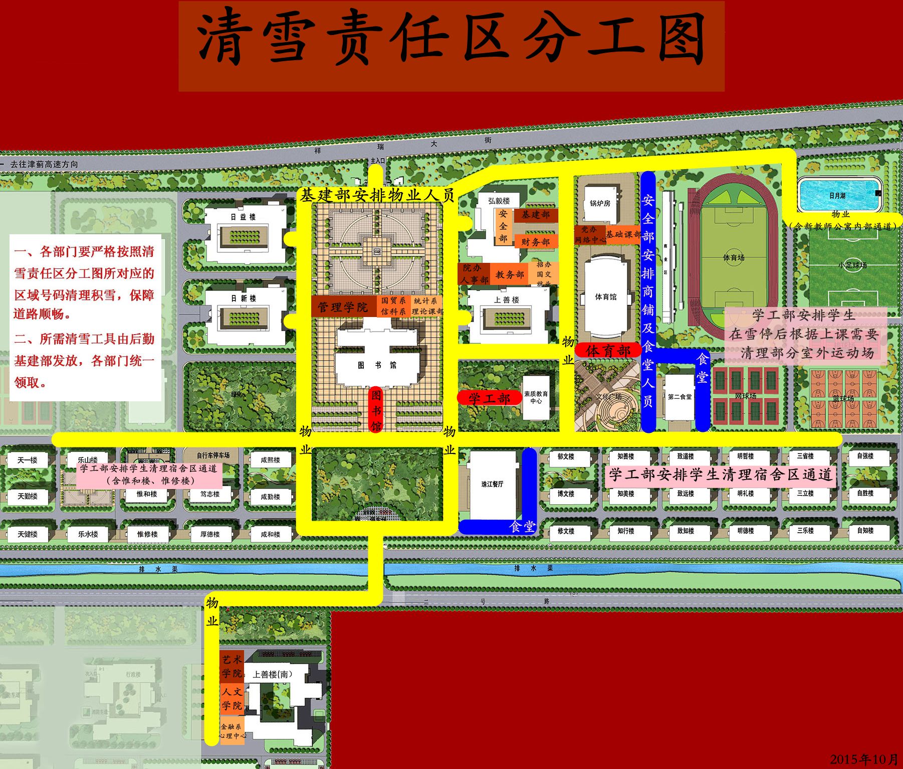 根据天津市政府清雪指挥部关于冬季清雪工作的指示精神,结合学院机构及区域变化情况,现将本年度清雪工作安排如下: