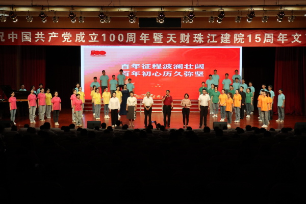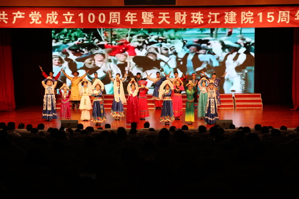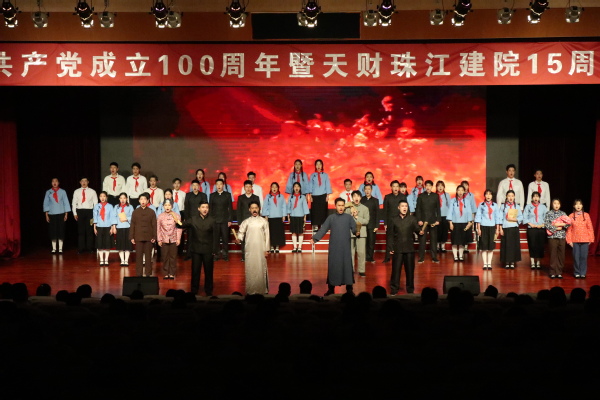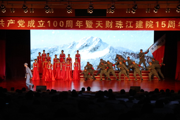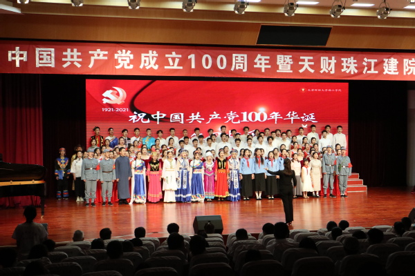 演出共分星火、征程、起航与复兴四个主题板块。演员们身着民国时期服装,以表演与合唱相结合的形式,在一曲热情洋溢的《毕业歌》与庄重严肃的《国际歌》中回忆建党过程;通过朗诵、表演及舞台剧等多种形式,再现了“长征”过程中过雪山草地的艰难、共产党人在《红色家书》中教导后代的感人故事;身着各民族服饰的演员齐聚一堂,通过欢快的歌舞形式,在全场观众明快的掌声节拍中,喜悦地唱着《翻身农奴把歌唱》及《唱支山歌给党听》等歌曲,表达着对党的感恩;音乐系丁卉老师一曲《江山》,演出进入“复兴”主题,结合庆祝建党百年,视频回顾了学院15年的发展历程及取得的成就,坚定了全院师生在党的领导下,办好服务社会、人民满意高等教育的信心和决心。管理学院院长张英华教授、科研中心主任张盘铭教授、经济学院王伟老师、数据工程学院赵翠杰老师及经济学院学生党员代表张敬易、石芹六位老、中、青党员代表共同走上舞台,诉说着他们入党不忘初心、砥砺前行的足迹与心声,表达着对党的炽爱和百年华诞的祝福,与全场观众产生了强烈的共鸣,不时发出阵阵掌声。最后,一曲《没有共产党就没有新中国》的合唱把演出推向了高潮。