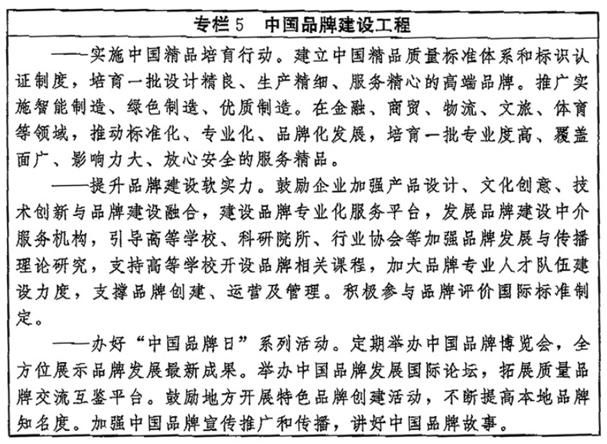 ——品牌建设取得更大进展。品牌培育、发展、壮大的促进机制和支持制度更加健全,品牌建设水平显著提高,企业争创品牌、大众信赖品牌的社会氛围更加浓厚,品质卓越、特色鲜明的品牌领军企业持续涌现,形成一大批质量过硬、优势明显的中国品牌。