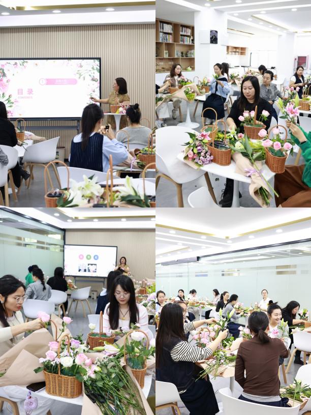 在轻松愉快的氛围中,教职工们表现出了极大的热情与创造力。大家纷纷拿起面前琳琅满目的花材,结合个人的审美巧思,动手创作属于自己的花艺作品。玫瑰的娇艳、百合的清香、康乃馨的温馨,再配以绿植的点缀,一篮篮错落有致、独具匠心的插花作品逐渐成型。讲师与助教穿插指导,教职工们相互交流借鉴,现场其乐融融。