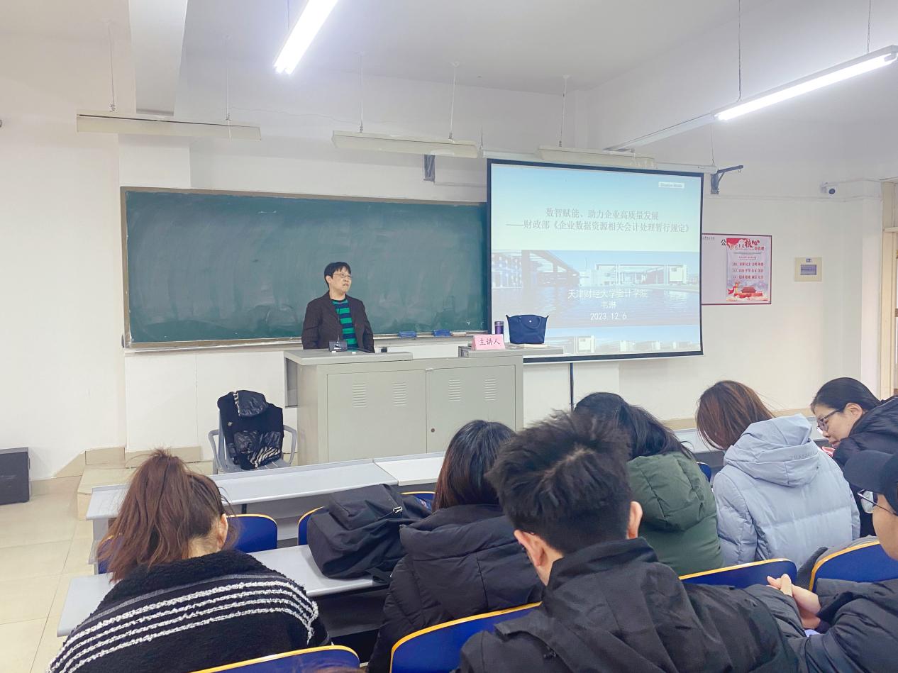 讲座上,韦琳教授回顾了数据资产的定义,阐释了《企业数据资源相关会计处理暂行规定》的出台背景。她指出在党的二十大报告中,提出加快建设数字中国、发展数字经济的任务,数字经济已成为我国经济发展的重要引擎。韦琳教授强调要学习贯彻习近平总书记的重要指示,充分发挥我国制度和市场优势,将数据视为基础资源和创新引擎,形成数据驱动型创新体系和发展模式。她还解读了《企业数据资源相关会计处理暂行规定》的内容,深入浅出的将数字经济与会计相结合,引领了会计学院对数智时代趋势的关注。