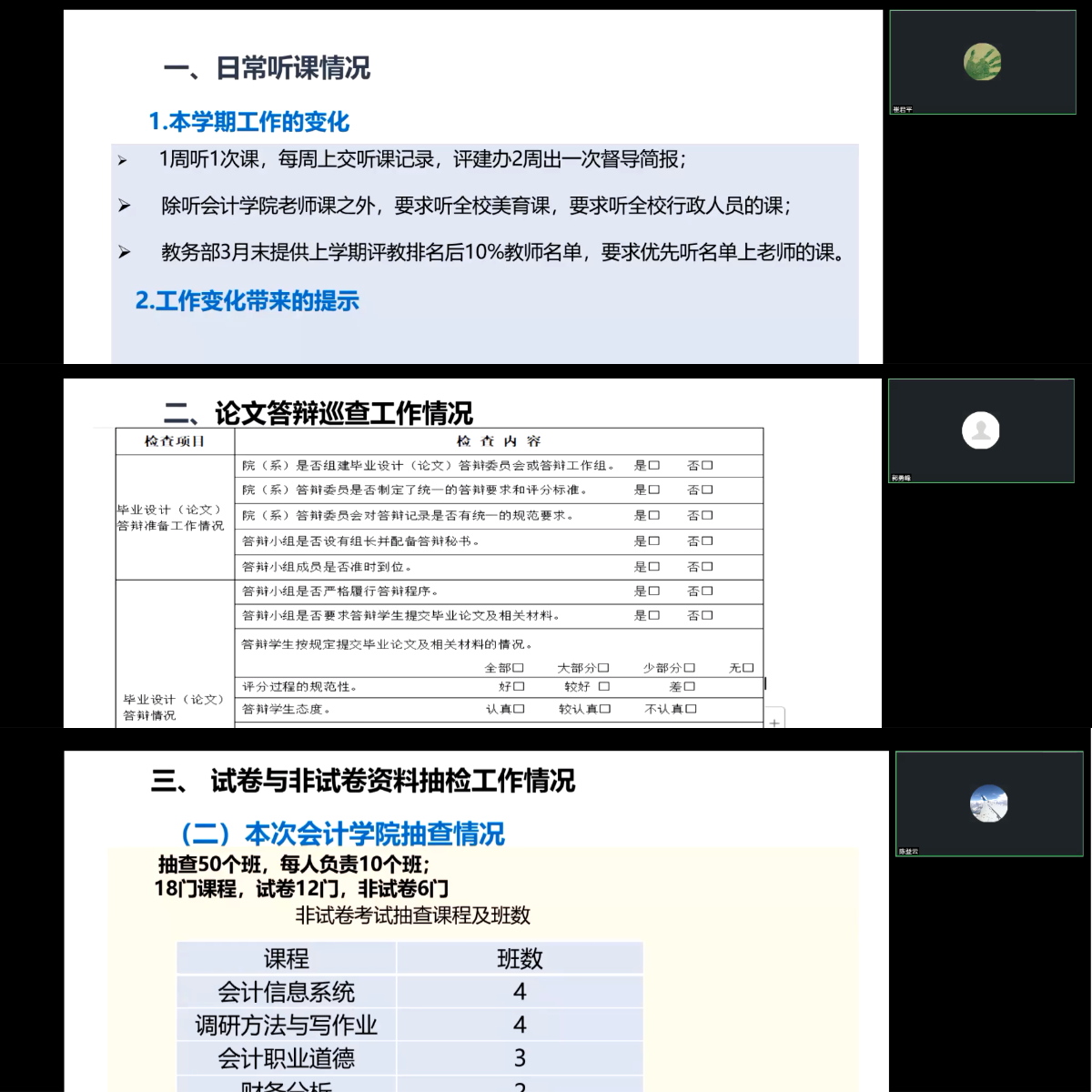 会计学院教学督导工作组成员分别从日常听课、毕业论文答辩巡查、上学期试卷资料检查这三方面对前10周的工作做了详细的汇报,同时对后10周的工作计划也做了说明。