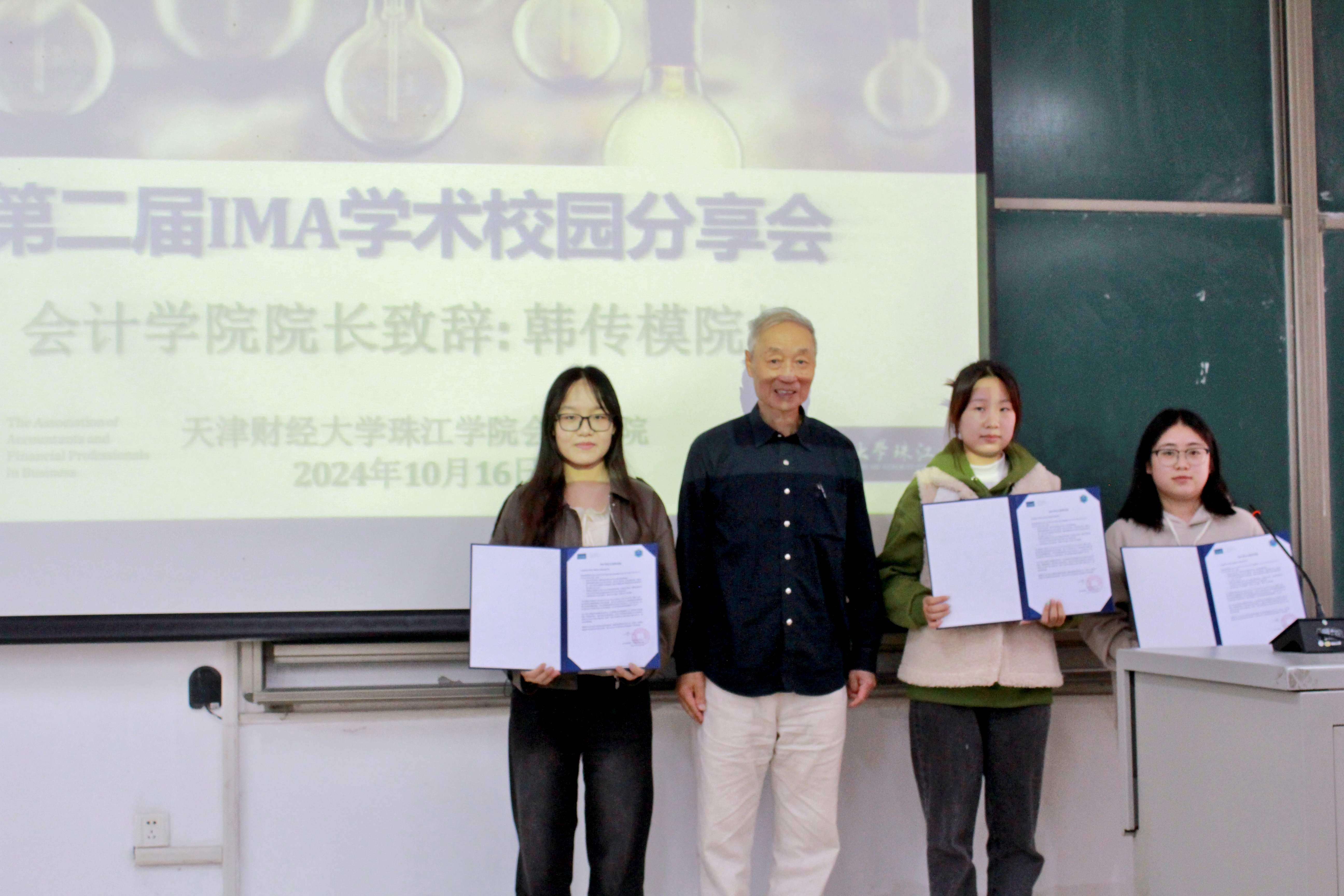 韩传模院长为BEAT365英国官网会计学院第二届IMA校园大使余静、范瑜、任禹锟三位同学颁发聘用证书。