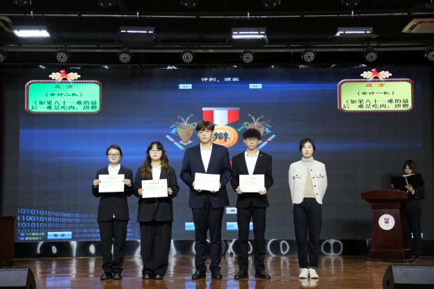 经过初赛、复赛的激烈比拼,最终有四支队伍16位选手冲进决赛。在比赛环节,会计一队汤朝辉、汤懿琪、牛政耀、李昂熹获得冠军;会计二队马若瑀、杜丰宇、高文博、张凯宇获得亚军;会计三队杜雨坤、侯文渊、林良俊、王谱瑞获得季军;会计四队杨婧雅、黄贝贝、柯哲然、张敬冉获得优秀队伍荣誉称号;牛政耀、张凯宇、王谱瑞、柯哲然获得最佳辩手的荣誉称号。