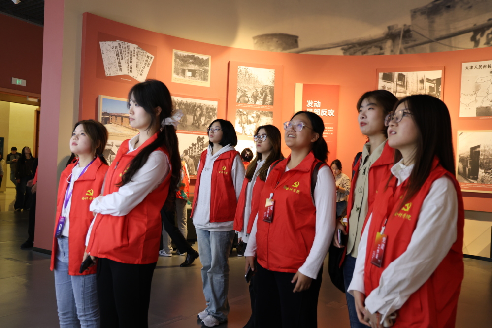 此次党日活动紧扣“抗日战争胜利80周年”核心主题,以展厅“奋起救亡”“津门浩劫”“市区抗战”“盘山烽火”“赢得胜利”“抗战英烈”六大板块为学习脉络,系统梳理天津地区抗战历史脉络,深入学习革命先辈在反侵略战争中的英雄事迹。从日军侵华背景下天津人民的“奋起救亡”,到侵略者铁蹄下的“津门浩劫”;从市区军民顽强抗争的“市区抗战”,到盘山根据地游击作战的“盘山烽火”;再到最终迎来和平曙光的“赢得胜利”,以及永载史册的“抗战英烈”事迹,师生党员们循着历史轨迹,全面理解了天津在华北抗战中的战略重要性,深刻体会到党领导下中华民族同仇敌忾、共赴国难的壮烈情怀。