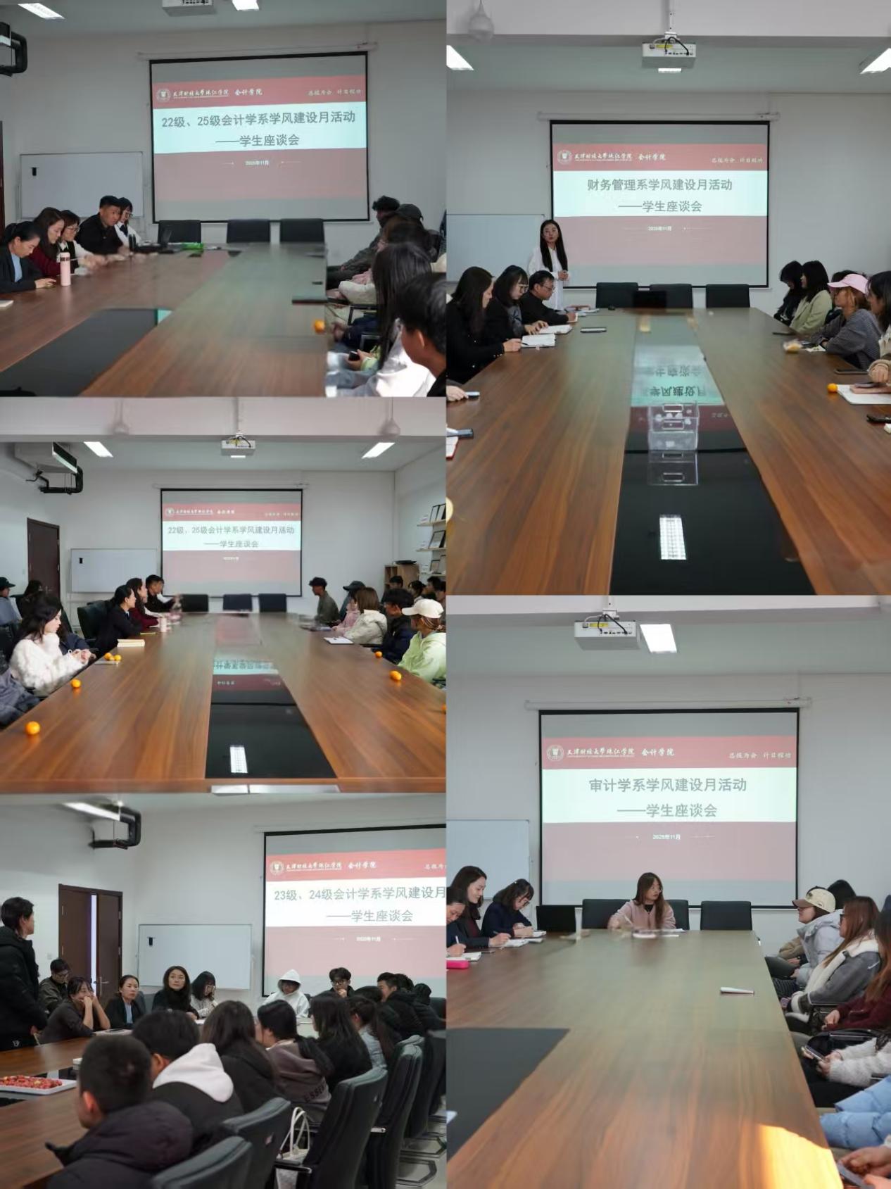 为深入了解学生学习情况,搭建师生沟通桥梁,切实解决学生在学习过程中的实际问题,会计学院于11月11日、13日、18日、19日分别召开了四场学生代表座谈会。院领导、各系主任、教研室主任与各年级、各专业学生代表齐聚一堂,就学院教育教学管理展开了热烈交流。