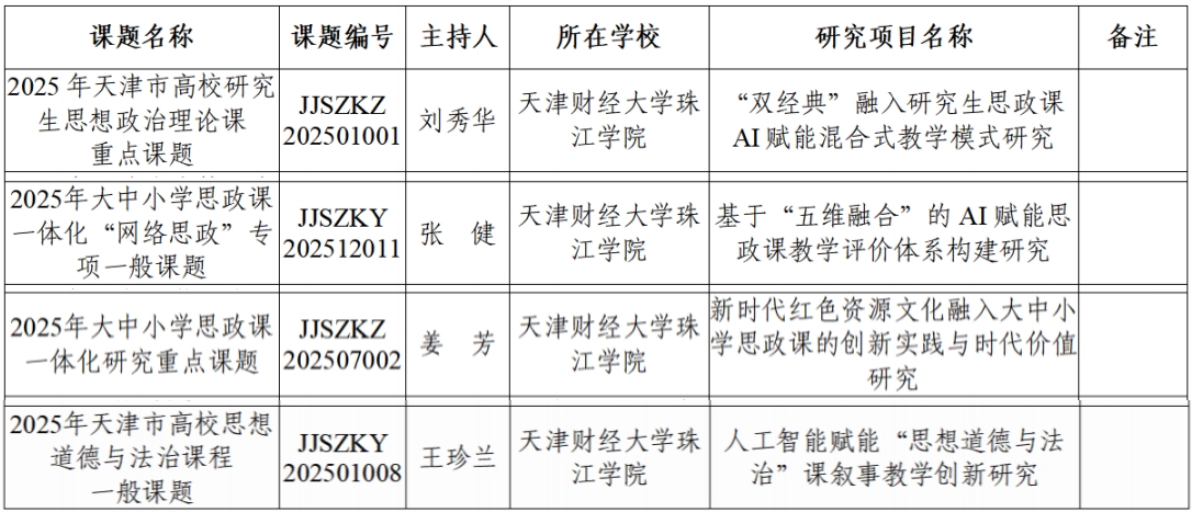 在扎实完成既有研究任务的同时,学院教师在2025年度各级各类项目申报中成功斩获八项课题立项。其中获批天津市思想政治理论课常设课题四项:刘秀华教授申报的《“双经典”融入研究生思政课AI赋能混合式教学模式研究》,获批天津市高校研究生思想政治理论课重点课题;姜芳老师申报的《新时代红色资源文化融入大中小学思政课的创新实践与时代价值研究》,获批天津市大中小学思政课一体化研究重点课题;张健老师申报的《基于“五维融合”的AI赋能思政课教学评价体系构建研究》,获批天津市大中小学一体化“网络思政”专项课题;王珍兰老师申报的《人工智能赋能“思想道德与法治”课叙事教学创新研究》,获批天津市高校思想道德与法治课程一般课题。姜芳老师申报的《人工智能背景下产业工人技能提升问题研究》被认定为市教委科研计划项目人文社科研究一般项目。周均锟老师申报的《“珠江星火”思政融媒体工作室:高校网络育人协同体建设》获批天津市首批校园融媒体建设项目。