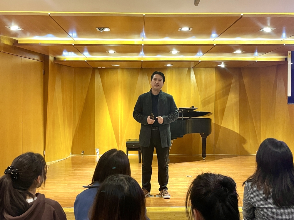 颁奖结束后,滑寒冰院长上台讲话,肯定了音乐系的教学工作,并对获奖学生表示祝贺。此外,滑院长还对音乐系师生提出期许,勉励师生再接再厉,继续在美育教学中探索创新,为学院美育建设做出贡献。曹鹏飞主任也以线上连线的形式,对获奖学生表示祝贺,更对音乐系接下来的美育工作提出了具体的要求。