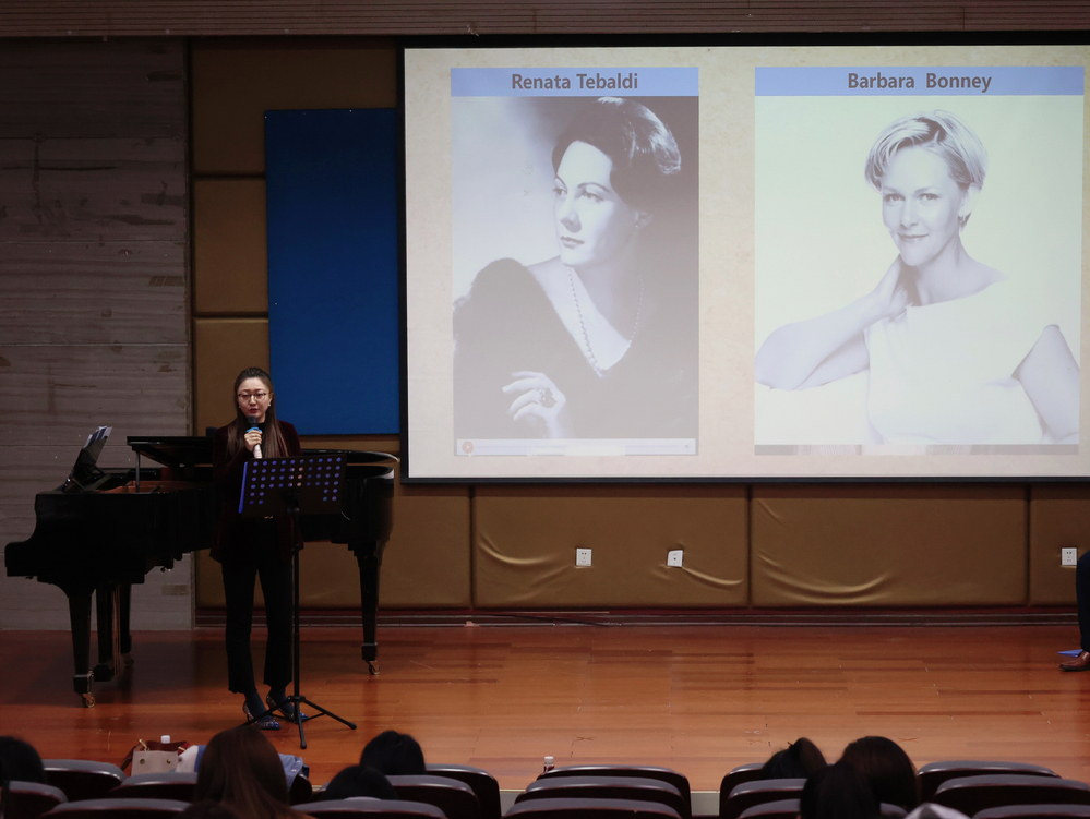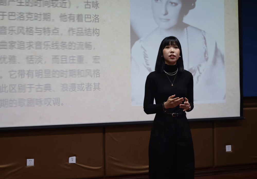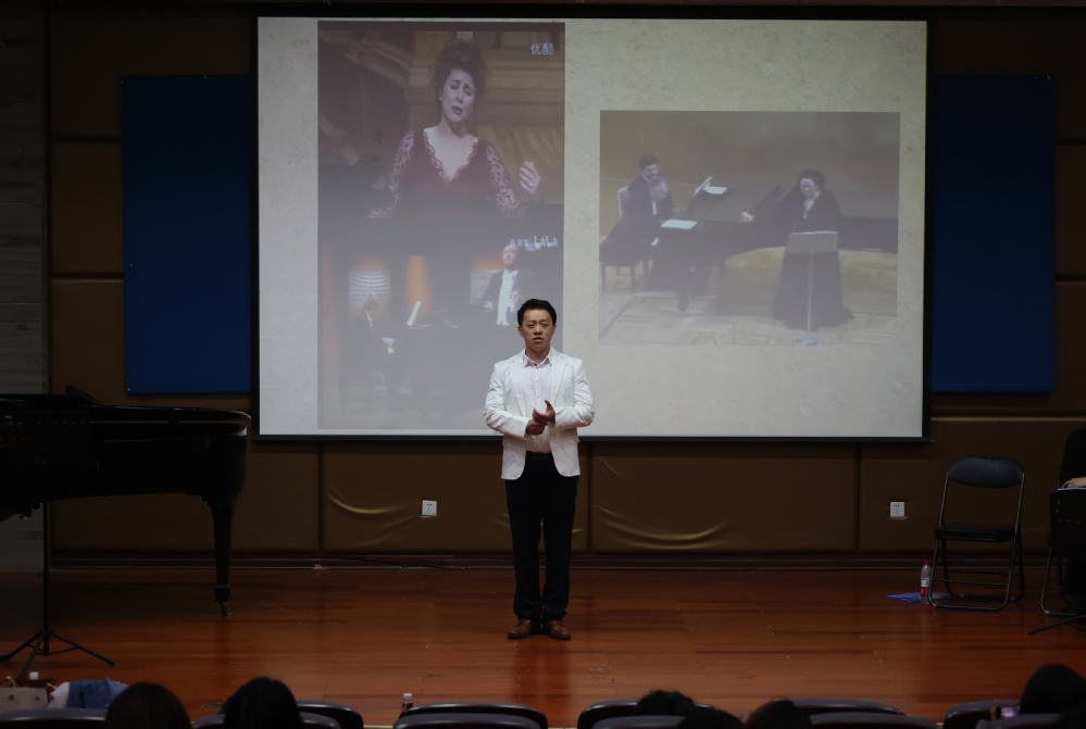仝樱子老师细致的介绍了作曲家及唱段剧情,并对人物性格进行了深入刻画分析,最后通过示范演唱向我们展示了女主人公对悲惨命运的感叹。