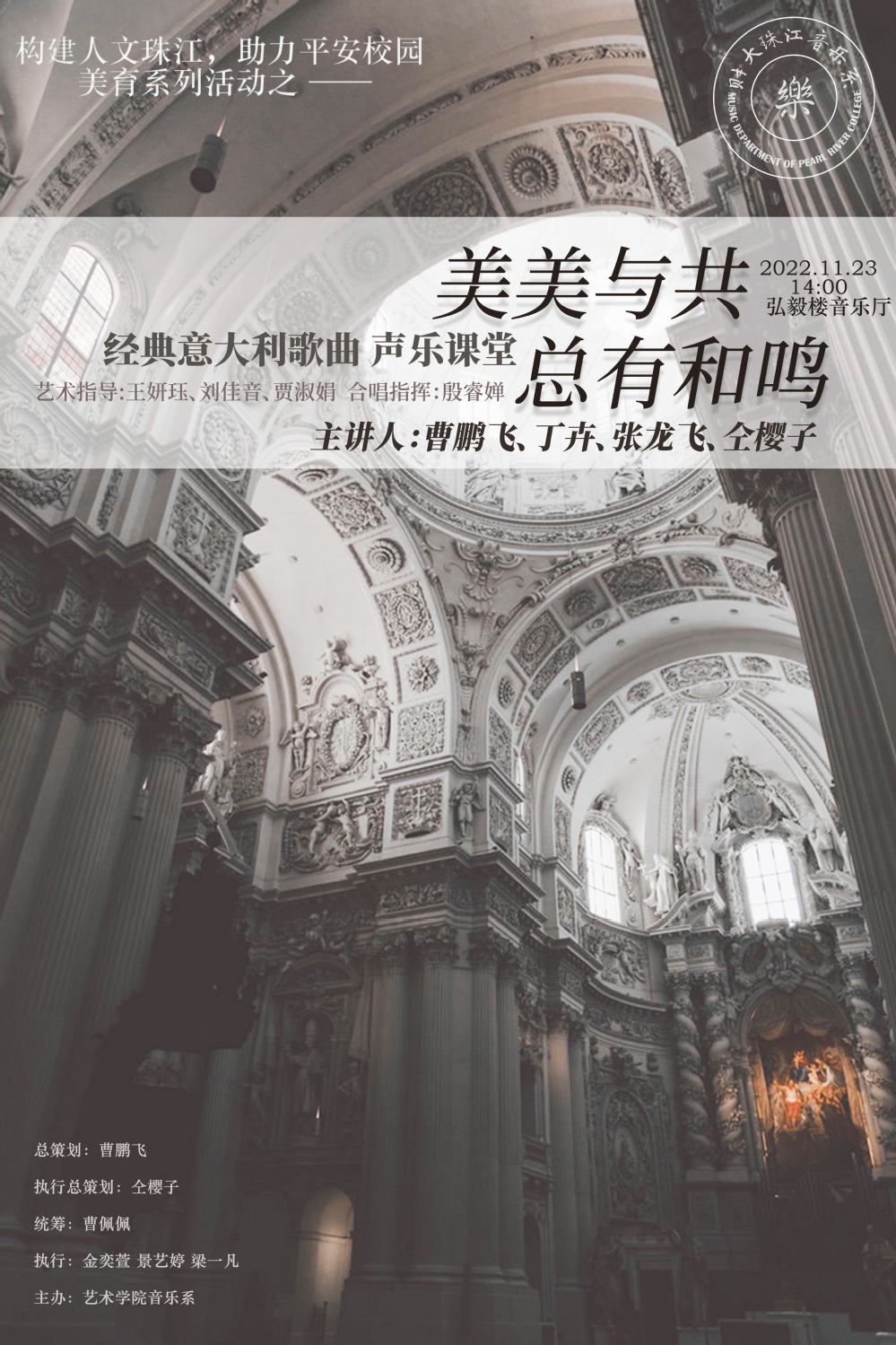 2022年11月23日下午,音乐系开展了“构建人文珠江,助力平安校园”秋季美育系列活动的第二场活动——“美美与共,总有和鸣”经典意大利歌曲声乐课堂。本次活动旨在展现音乐系声乐美育教学,丰富校园文化,以美育人。音乐系主任曹鹏飞担任活动总策划,由仝樱子老师带领学生工作组执行。活动于下午14:00在弘毅楼音乐厅正式拉开帷幕,艺术学院滑寒冰院长及音乐系全体师生出席了活动,大家共同度过了一个精彩且充实的下午。
