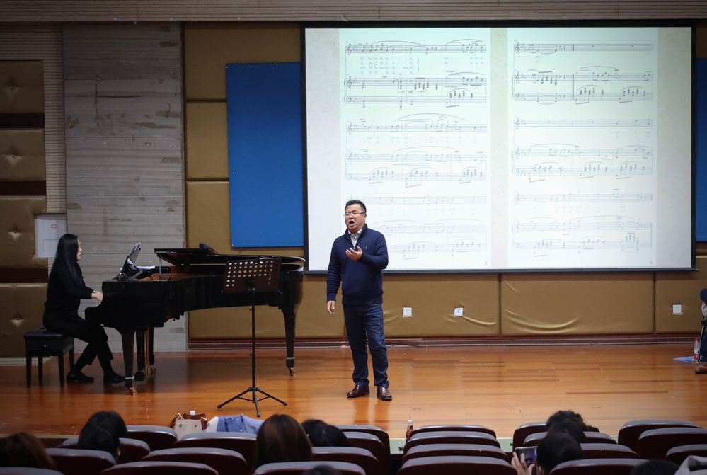 张龙飞老师在现场与同学们进行了互动,了解到现场的学生对《我亲爱的》这首歌曲非常熟悉,很多同学都学唱过,可见这首作品的经典,之后张龙飞老师给大家分析了作品的曲式结构,并通过示范演唱指出了演唱中需要注意的问题。