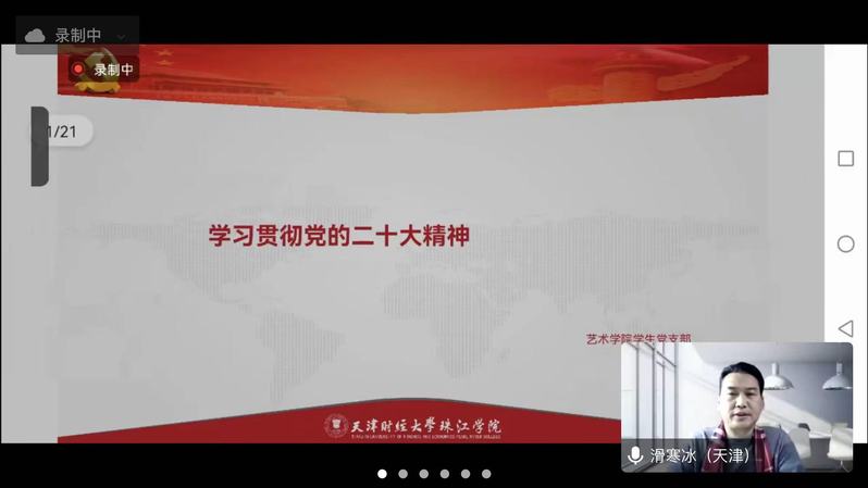 然后,学工办副主任翟文通过PPT文件,从大会主题,十年来三件大事,跳出历史周期律的自我革命,党的中心任务、中国式现代化的五个特色、中国式现代化的本质要求、牢牢把握的五个重大原则,带领大家学习贯彻党的二十大会议精神。